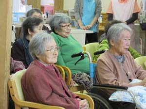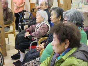『三味線』 3月18日に、『みずほ会』の皆様が三味線のボランティアに来てくださいました。 入居者様も、懐かしい曲をいっしょに合唱されていました。 1.神楽せり唄(宮崎県) 2.シャンシャン馬道中(宮崎県) 3.のさん節(宮崎県) 4.隠岐祝い音頭(島根県) 5.りんご節(青森県) 6.北海盆唄(北海道) 7.秋田大黒舞(秋田県) とても素晴らしい三味線の音色と歌声が、施設中に響いていました♪ みずほ会の皆様、ありがとうございました。