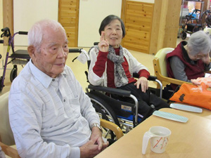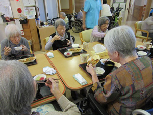 利用者様たちの周りで、焼きそばやたこ焼きを作っています。 今日は特別に、ノンアルビールもありました(希望者のみ)。 とてもおいしそうに飲んでいらっしゃいました♪