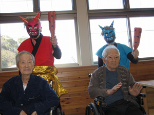 赤鬼と青鬼におじゃみを投げてやっつけていただき、記念撮影をしました♪